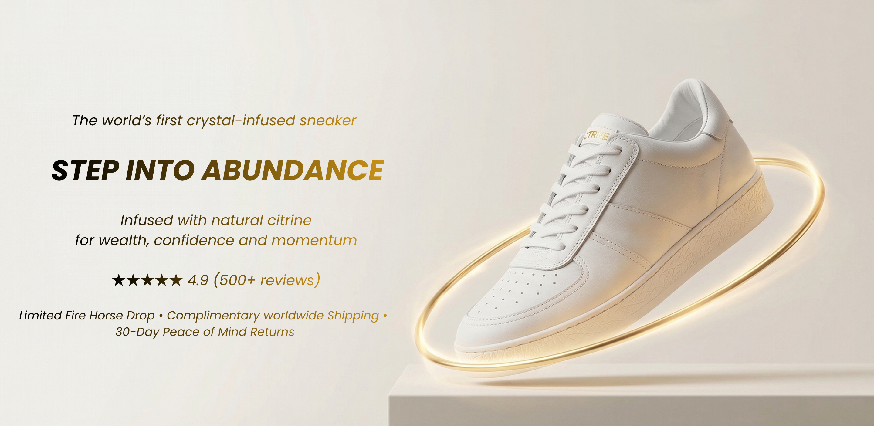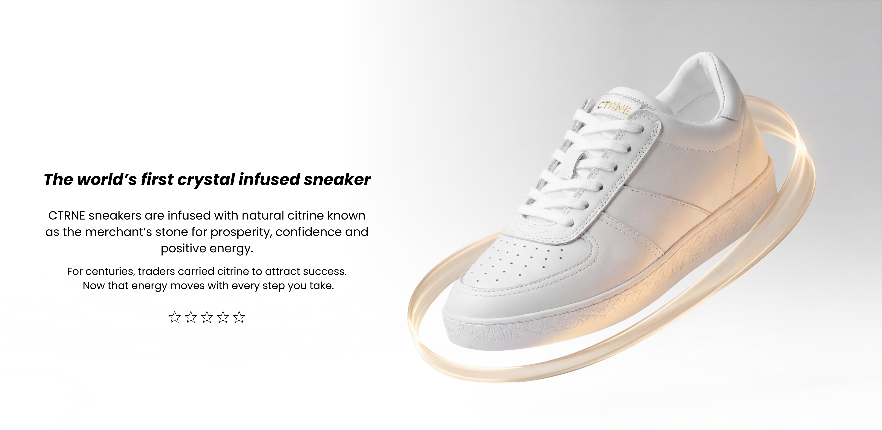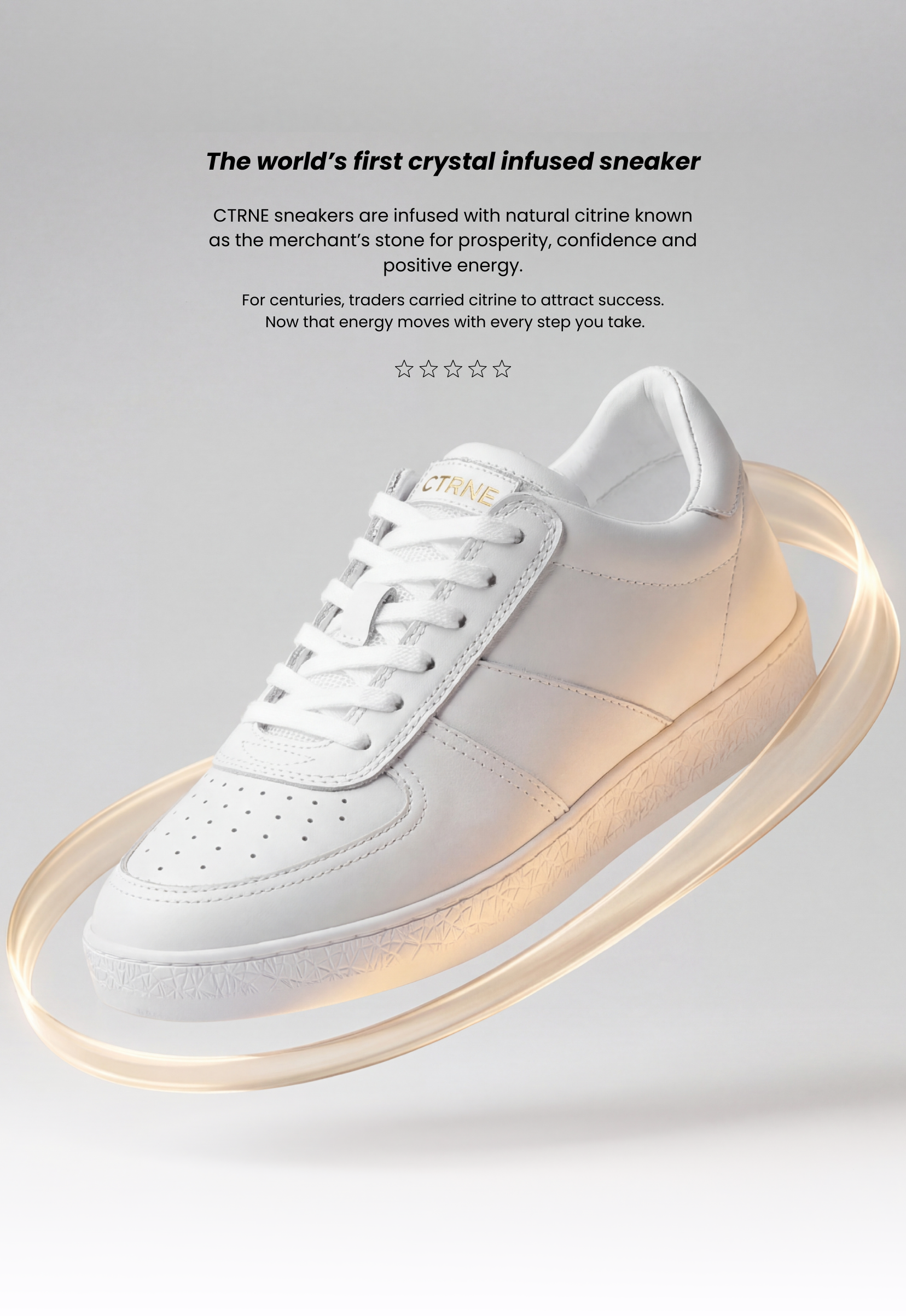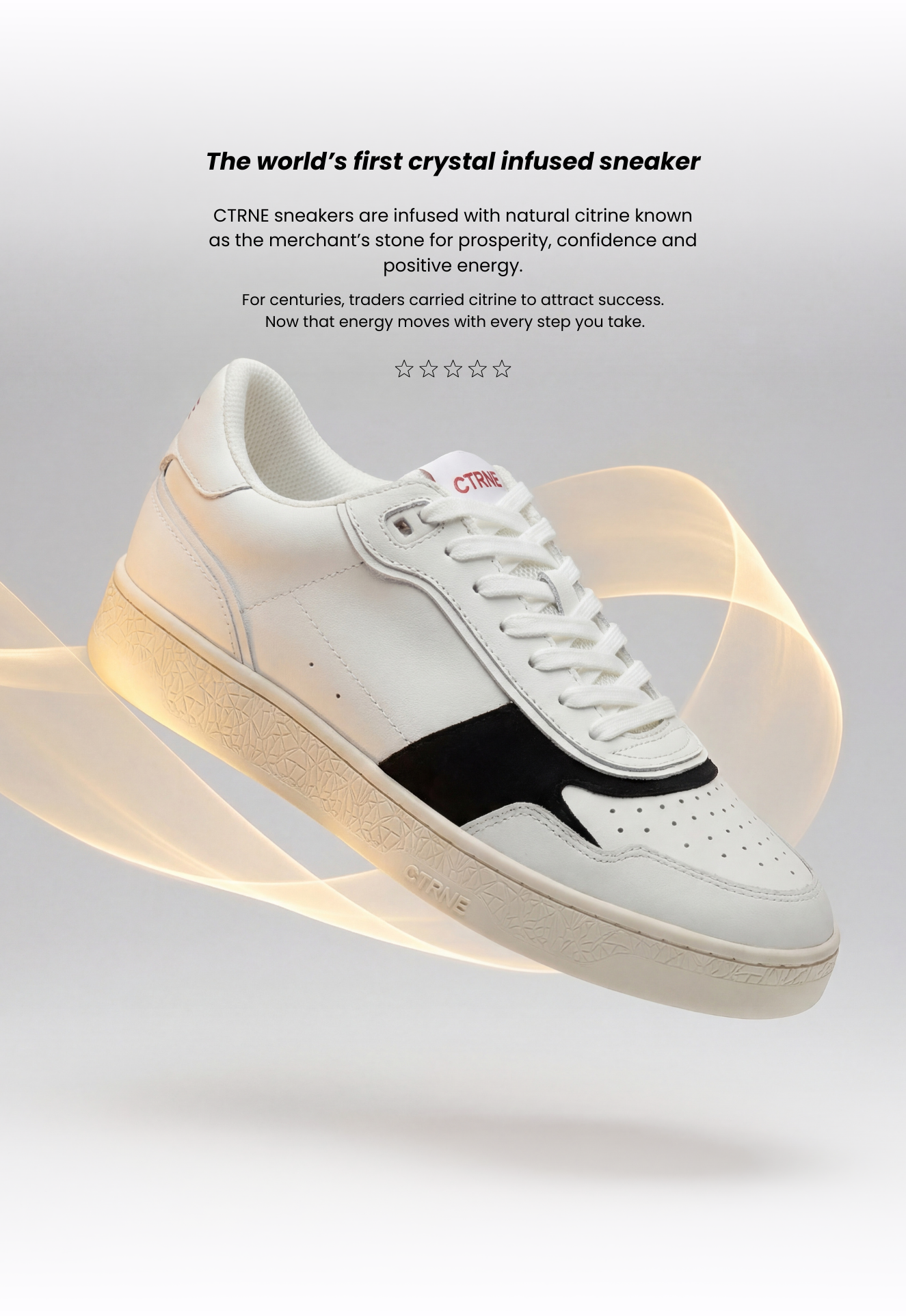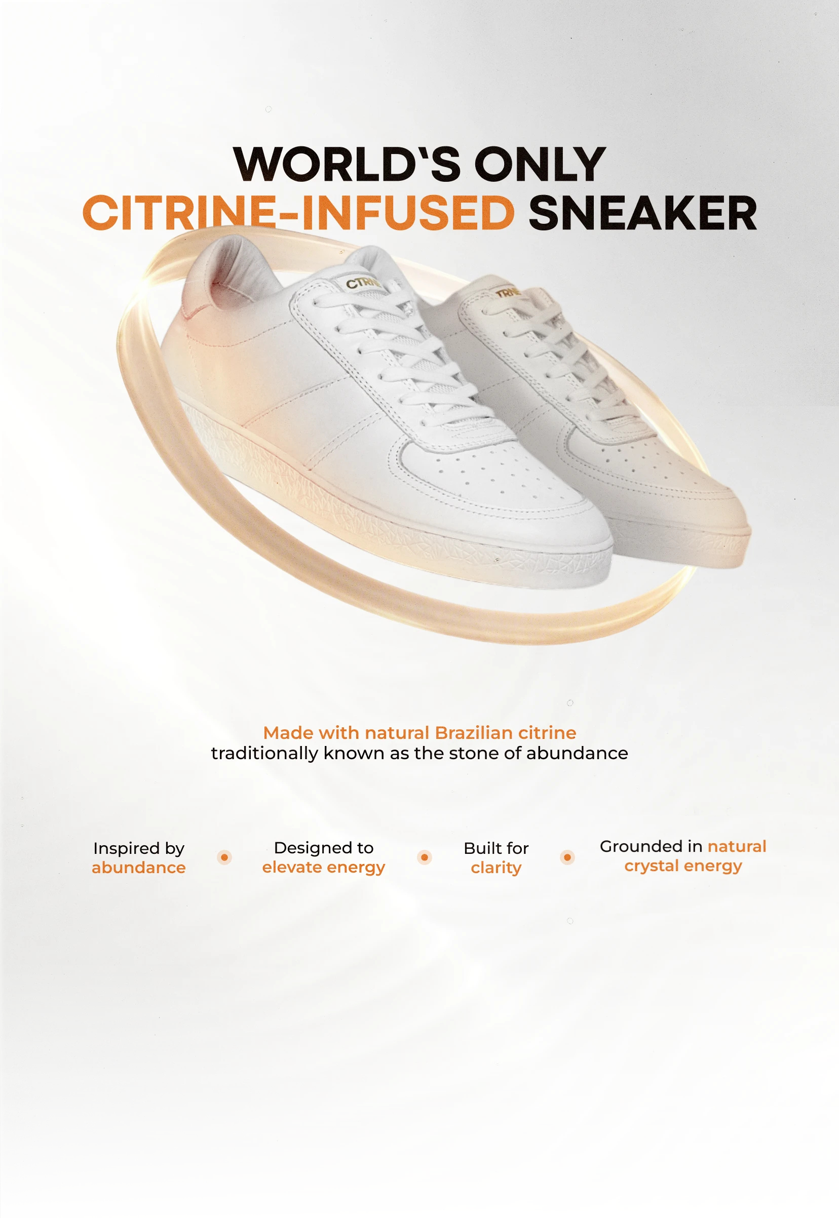 We chose Citrine because it is often referred to as the stone of abundance and is believed to be associated with confidence, optimism and positive energy. When you wear CTRNE Citrine crystal sneakers, a carefully cut natural Citrine crystal sits within the sole of the shoe.